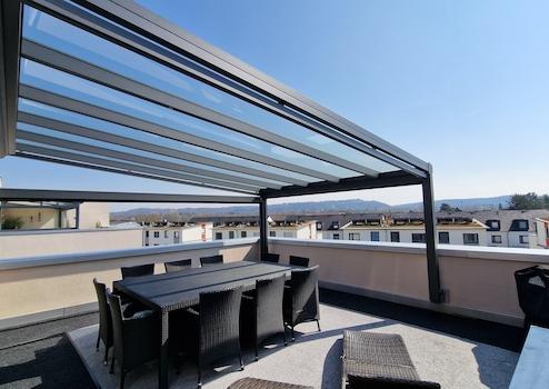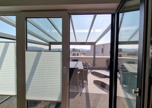 Die Dachterrasse ist mit einer Überdachung ausgestattet, mit LED Leuchten,für genügend Schatten und Privatsphäre. Alles über Funk steuerbar.