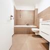Das innenliegende Badezimmer mit Wanne ist eine echte Wellness-Oase. Es verfügt über moderne, großformatige Fliesen, einen Waschtisch, einen Spiegel, ein WC und eine Badewanne. Hier finden auch Waschmaschine und Trockner Platz.