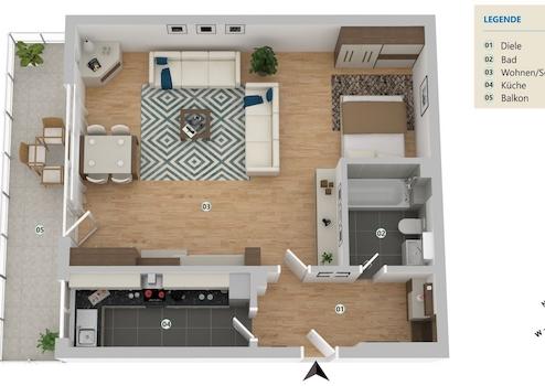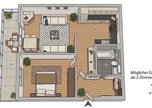 So kann die Wohnung perspektivisch zu einer 2-Zimmer-Wohnung mit Wohnküche umgestaltet werden.