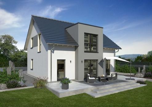 Das Einfamilienhaus, welches als Fertighaus gebaut werden kann, zeichnet sich in der Architektur durch zwei dritte Giebel mit Flachdach aus. An der Vorderseite des Hauses folgt eine Haustürüberdachung bis in das seitlich gelegene Carport. Im Erdgeschoss ist ein großzügiger Wohn-/Ess- und Kochbereich vorgesehen.