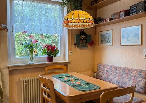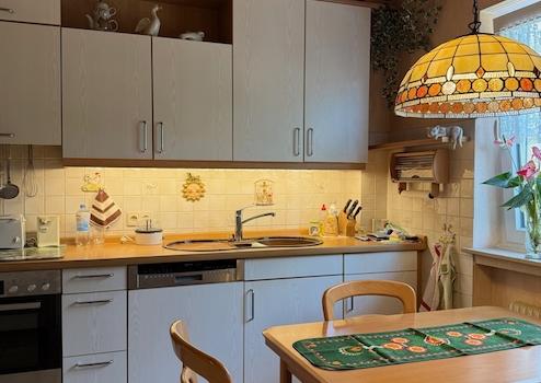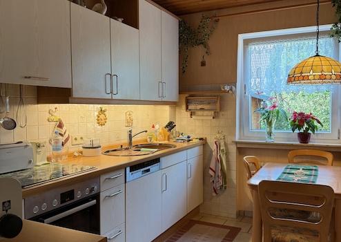 Die Küche ist komplett ausgestattet. Die Küche wirkt freundlich und hell und bietet auch genügend Platz für eine Sitzecke.