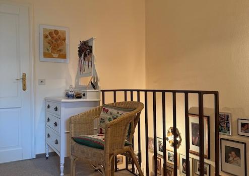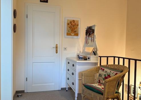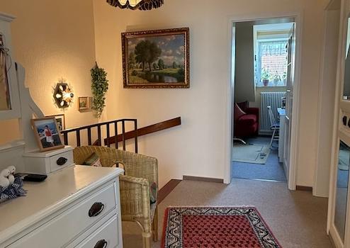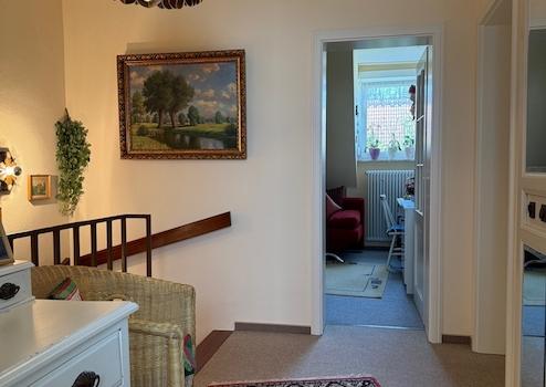 Vom Flur im Erdgeschoss gelangt man über eine Holztreppe in das Obergeschoss.