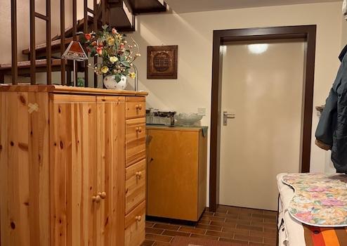 Vom Flur im Erdgeschoss gelangt man über die Holztreppe in das Untergeschoss beziehungsweise in den Keller.