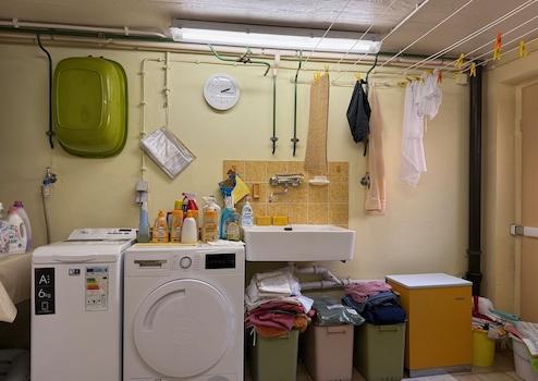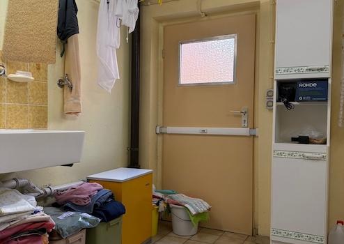 Den Flur links gelangt man in die helle Waschküche. Die Waschküche verfügt zudem über eine Kelleraußentreppe und für in den Garten.