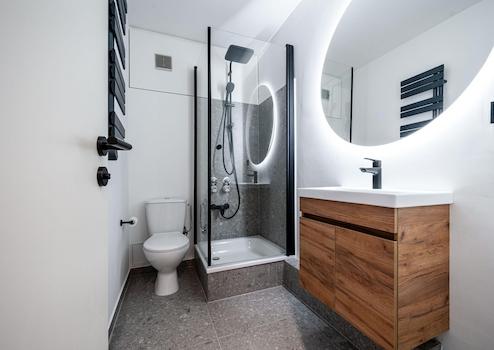 • Badezimmer: Terrazzofliesen, eigener Waschmaschinenanschluss, neue Dusche und neues WC, stylischer LED Spiegel, Handtuchheizer.