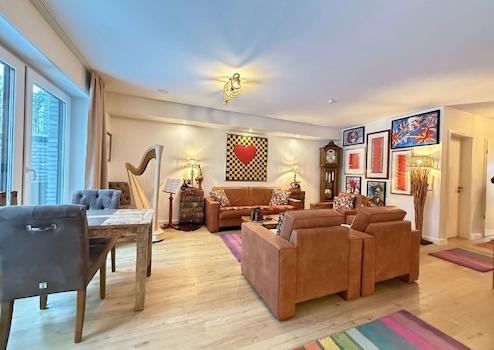 Auf ca. 115 m² Wohnfläche entfaltet sich ein großzügiges Raumgefühl, das durch bodentiefe Fenster, eine offene Grundrissgestaltung und eine moderne technische Ausstattung zusätzlich unterstrichen wird. Licht, Raum und Wohnkomfort stehen hier im Mittelpunkt. Die Kombination aus exklusiver Innenausstattung, moderner Haustechnik und einer privaten Gartennutzung, die ausschließlich dieser Wohnung zugeordnet ist, verleiht dem Objekt einen besonderen Seltenheitswert. Hier genießen Sie die Vorzüge einer Eigentumswohnung, ohne auf die Freiheiten eines eigenen Hauses verzichten zu müssen. Durch Ihre Barrierefreiheit eignet sich die Erdgeschosswohnung auch ideal für Rollstuhlfahrer, Senioren oder Menschen mit körperlichen Einschränkungen.
