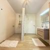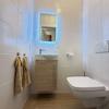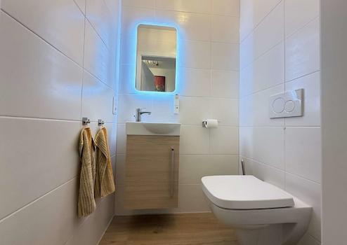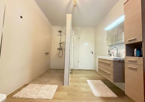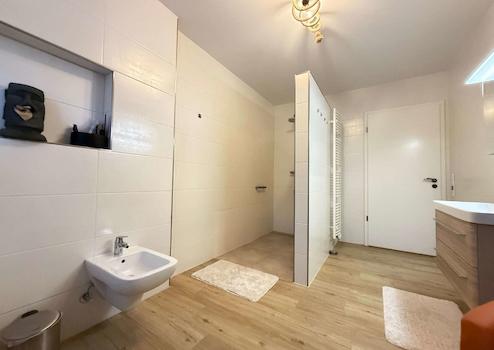 Das moderne Badezimmer ist hochwertig ausgestattet mit einer bodentiefen Dusche, eleganten Badmöbeln sowie einem Anschluss für eine Infrarotsauna – Wellnesskomfort in den eigenen vier Wänden. Ergänzt wird das Raumangebot durch ein separates, stilvolles Gäste-WC.