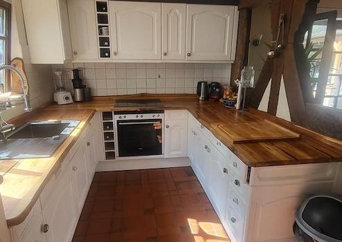 Fussbodenheizung im Erdgeschoss, doppelt isolierverglaste Holzfenster. einen offenen Kamin, der zum entspannen im Kaminzimmer einlädt, eine offene Küche mit einer Einbauküche im Landhausstil, ein Gäste-WC mit Tageslicht, eine Massivholztreppe führt in das Obergeschoss. Der Bodenbelag aus Landhausdielen in den Zimmern im Obergeschoss, ein raumhoher verglaster Giebel im Wohnzimmer. Der eine einzigartige Atmosphäre schafft, ein superschickes Tageslicht Wannenbad mit Mosaikakzenten im Obergeschoss und viele freiliegende Balken und Holzständerwerk, um nur einige der zahlreichen Details zu nennen.