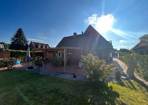 Das ca. 870 m² große Grundstück ist nahezu uneinsehbar und äußerst gepflegt. Die Hoffläche auf der Vorderseite ist mit modernen roten Vierkantsteinen gepflastert und bietet eine ansprechende Zufahrt zum Haus und zur Garage. Über eine große Pforte gelangen Sie bequem in den Gartenbereich.