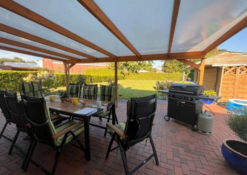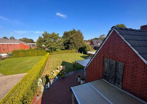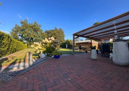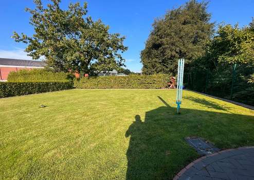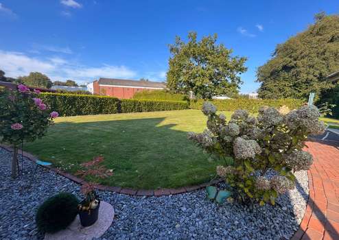 Der Garten ist überwiegend pflegeleicht angelegt, mit großzügiger Rasenfläche, eingefasst von roten Vierkantsteinen. Eine hohe, immergrüne Hecke sorgt im hinteren Grundstücksbereich für Privatsphäre. Ein Gartenhaus bietet praktischen Stauraum für Gartenmöbel und Geräte. Auch die Terrassenflächen sind hochwertig gepflastert.