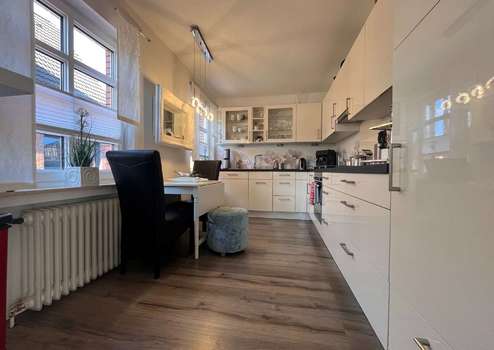 - Im Erdgeschoss überzeugt eine hochwertige, weiße Einbauküche im modernen Design, die zum Kochen und Genießen einlädt.