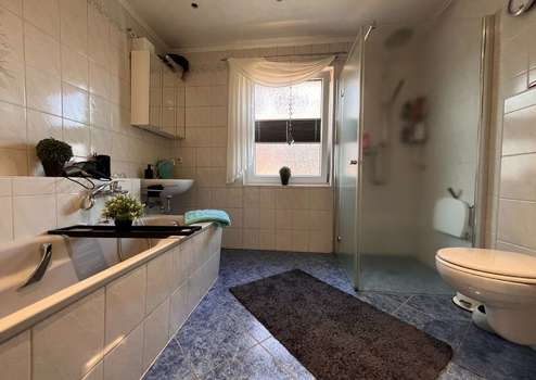 - Das Badezimmer im Erdgeschoss verfügt über eine ebenerdige Dusche, Badewanne, wandhängendes WC sowie ein Handwaschbecken mit Spiegelschrank.
