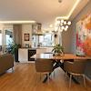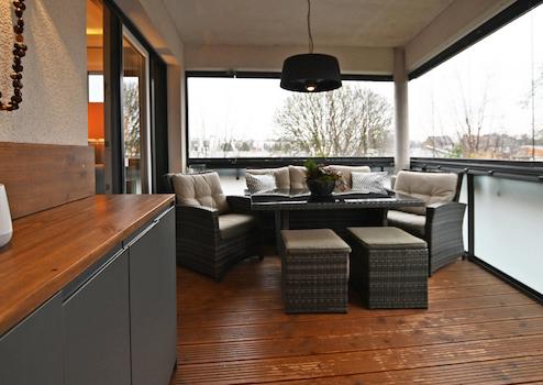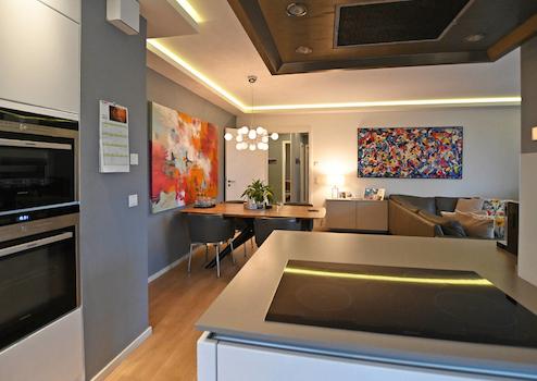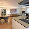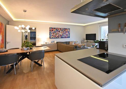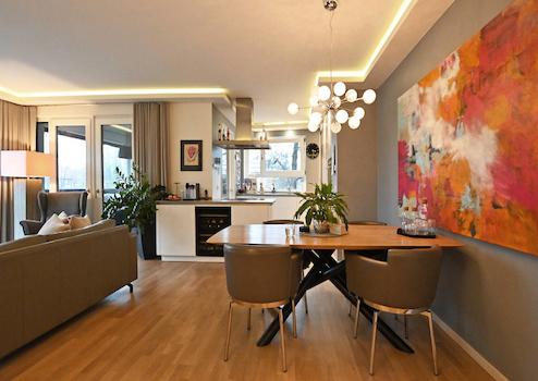 Der Schnitt und die Ausstattung der Wohnung bieten eine wirklich besondere Lebensqualität. Ein Wohn- & Essbereich mit offener Küche und Kochinsel geht mit zwei Zugängen in eine große Loggia über, die mit verschiebbaren Glaselementen eine windgeschützte Privatsphäre ermöglicht. Die moderne, zeitlose Küche verfügt über eine technisch sehr gute Ausstattung: z.B. einen extra Weinkühlschrank und neben dem Backofen auch über einen Dampfgarer - beide Geräte liegen oberhalb Hüfthöhe und können parallel zum Einsatz kommen.