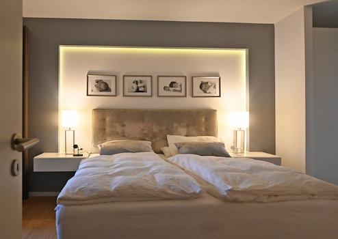 Ein weiterer Balkon, der eine gemütliche Sundowner-Atmosphäre spendet, befindet sich am großen Elternschlafzimmer, an das sich begehbare Kleiderschränke anschließen.
