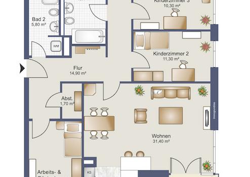 Die Wohnung hat weitere drei gut nutzbare Zimmer, die aktuell zwei Kinderzimmer und einen Hobby- und Arbeitsraum darstellen. Die Wohnräume sind mit geschmackvollem, leicht geweißtem Holzparkett ausgelegt und die gesamte Wohnfläche wird mit einer sparsamen Fußbodenheizung erwärmt. Für alle Bewohner stehen zwei geräumige Badezimmer (1 Dusch- und 1 Wannenbad) zur Verfügung, wobei das große Duschbad auch den Platz für Waschmaschine und Trockner vorsieht.