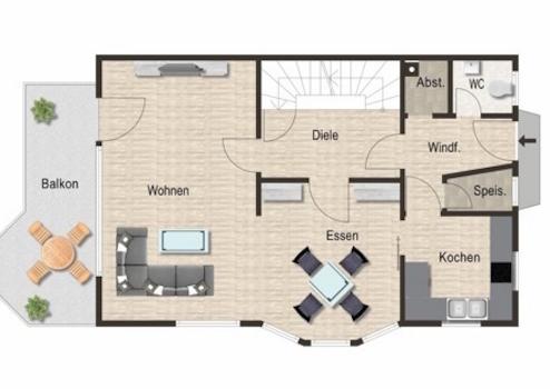 - Eine Diele mit Platz für eine Garderobe und Treppenaufgang in die obere Etage. So sind Sie bei Besuchen Ihrer Kinder in Ihrem Wohn-Essbereich nicht gestört, da der Eingangsbereich und der Treppenaufgang abgeschlossen sind.