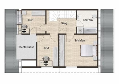 - Zwei Kinderzimmer, die zum Wohlfühlen einladen und jeweils einen Zugang zur Dachterrasse haben.