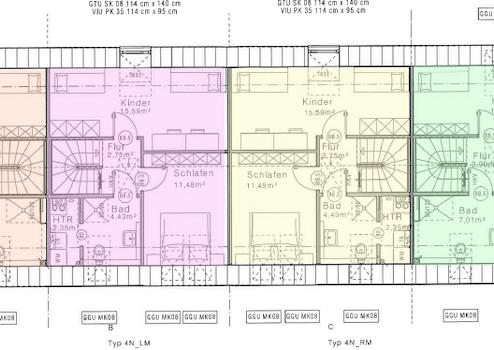 Die Wohneinheiten im Reihenhausstil verfügen über ca. 94 m2 für die Einheiten A und D sowie ca. 86m2 für die Einheiten B und C und bieten somit viel Platz für Ihren individuellen Raumbedarf.