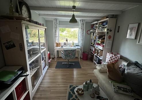 Im Untergeschoss des Wohnteils befinden sich die großzügige Küche, zwei Abstellräume, ein Wohnzimmer mit Kamin, ein Badezimmer und ein weiterer Raum, der bisher als Büro genutzt wurde.