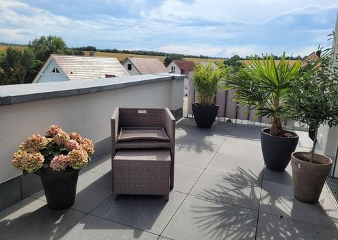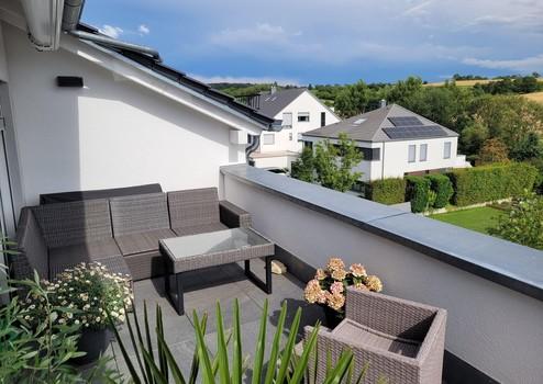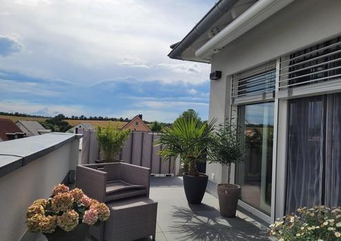 •Traumhafte Dachterrasse: Die von Wohn- und Schlafzimmer zugängliche Dachterrasse lädt zum Entspannen und Genießen ein. Eine elektrische Markise sorgt für ausreichend Beschattung an sonnigen Tagen.