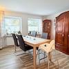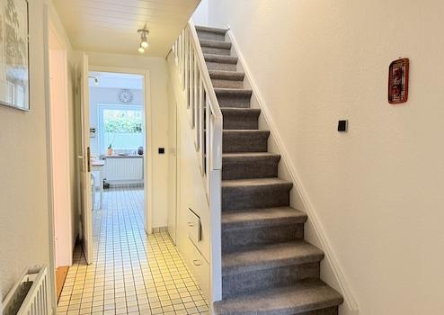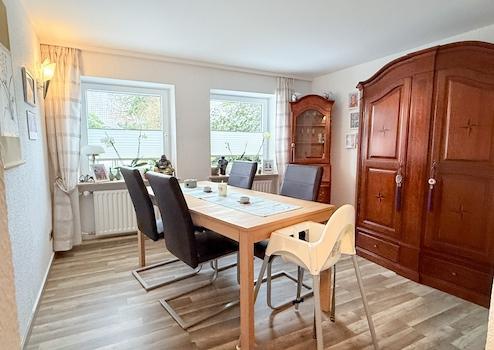 Im Erdgeschoss befinden sich ein großzügiges Wohn‑ und Esszimmer, eine Küche, ein Tageslichtbad mit Badewanne, ein Hauswirtschaftsraum, in dem auch die Heizung untergebracht ist, ein Flur mit Treppenaufgang sowie ein Windfang als Eingangsbereich.