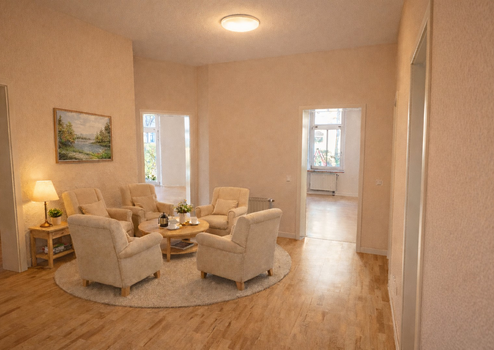 In dieser barrierearmen Senioren-WG teilen sich vier Senioren und Seniorinnen eine großzügige Wohnung mit insgesamt 146 m² Wohnfläche. Die vier geräumigen, hellen Zimmer bieten jedem Bewohner seinen ganz persönlichen Rückzugsort – ein Platz für Ruhe, Privatsphäre und das eigene Leben.
