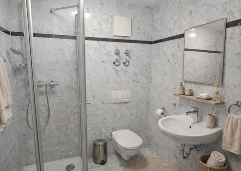 - Bad mit Dusche, Handtuchheizkörper, WC, Waschbecken und Waschmaschine
