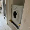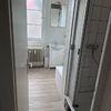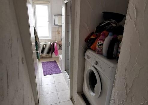 Im Duschbad, mit Waschbecken, Spiegelschrank und separater Toilette, steht zusätzlich die Waschmaschine.