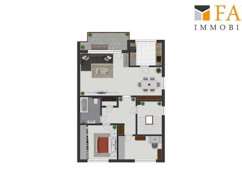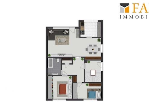 Das lichtdurchflutete Dachgeschoss ist ein echtes Highlight. Zwei Schlafzimmer, Wohnzimmer, Küche und Bad bieten den perfekten Rückzugsort für die älteren Familienmitglieder oder als separater Bereich für erwachsene Kinder. Der sonnige Balkon ist der ideale Ort, um den Tag in Ruhe ausklingen zu lassen.