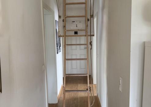 Diese Zimmer sind über einen schmalen Flur erreichbar, von dem auch der noch nicht ganz fertig ausgebaute Dachboden durch eine Bodenauszugsleiter erreichbar ist.