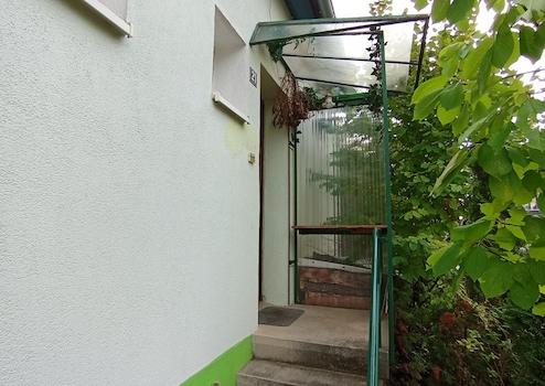 Erdgeschoß 3 Zimmer, Küche, Bad und WC. Hier hat man vom Wohnzimmer direkten Zugang zum kaum einsehbaren Garten mit einer überdachten Terrasse.