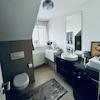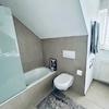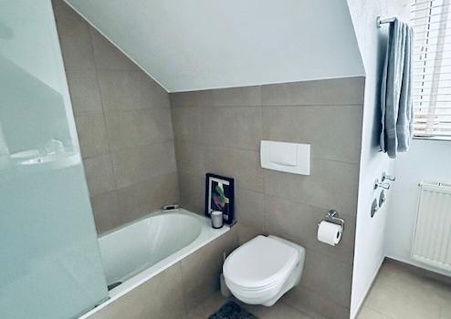 - Tageslichtbad mit Badewanne mit Glasduschtrennwand, WC, Waschbecken und Waschmaschinenanschluss, modern gefliest