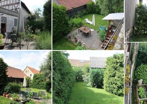 Nahezu uneinsichtiger Garten durch hohe Hecken. Hochbeete. Durchgang im Zwischenbau von Garten zum Hof. Das Anwesen hat einen schönen geschützten Innenhof, der optimal gestaltet werden kann.