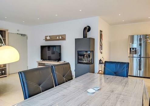 Der offene, lichtdurchflutete Wohnbereich geht fließend in die moderne, hochwertige Einbauküche über, die mit Markengeräten ausgestattet ist und keine Wünsche offenlässt. Eine innovative Luft-Wärmepumpe sorgt über die Fußbodenheizung für wohlige Wärme im gesamten Haus. Der Kamin im Wohnzimmer ergänzt das gemütliche Ambiente und lädt zu entspannten Abenden ein.