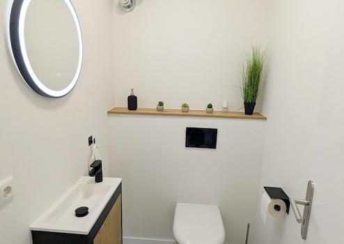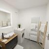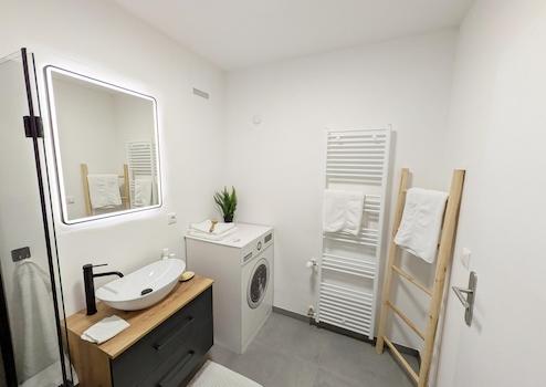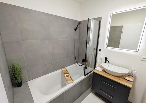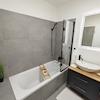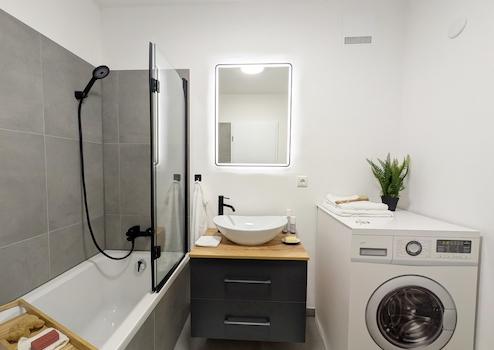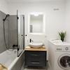 Genießen Sie entspannende Stunden in dem neu gestalteten Badezimmer mit einer großzügigen Badewanne und hochwertigen Armaturen. Nach einem wohltuenden Bad können Sie Ihr Handtuch bequem vorgewärmt vom neu installierten Heizkörper nehmen. Zudem finden Sie hier ausreichend Platz für Ihre Waschmaschine und Ihren Trockner.