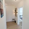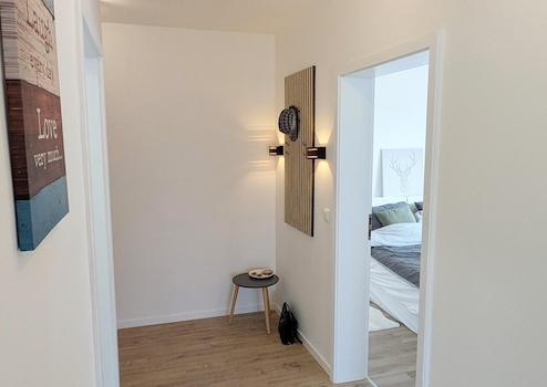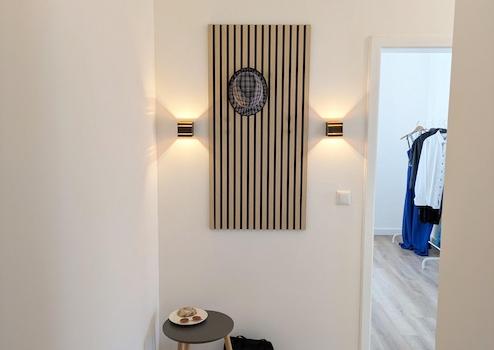 Über den sehr geschmackvoll gestalteten Eingangsbereich und Flur erreichen Sie bequem alle Zimmer der Wohnung. Eine Akustikpaneele wurde hier als Garderobe installiert.