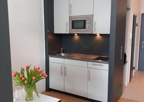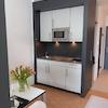 Marken-Einbauküche mit Kühlschrank und Gefrierfach, Spüle, eingebauter Mikrowelle und modernem Ceran-Kochfeld, Bett mit Matratze und Bettkasten, Raumteiler mit Kleiderschrank, Esstisch, 2 Stühle, Bürotisch und Sideboard, Echtholzparkett, modernes Bad mit bodengleicher Dusche