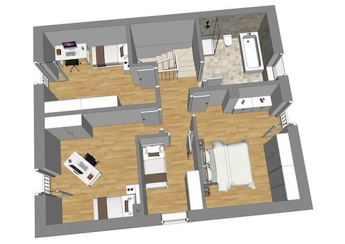 Die Wohnräume verteilen sich auf 2 Ebenen - dem Erdgeschoss und dem Obergeschoss. Auch eine große Terrasse und ein eigener Gartenbereich gehören zu diesem Immobilienangebot.
