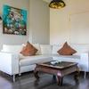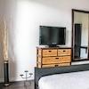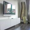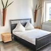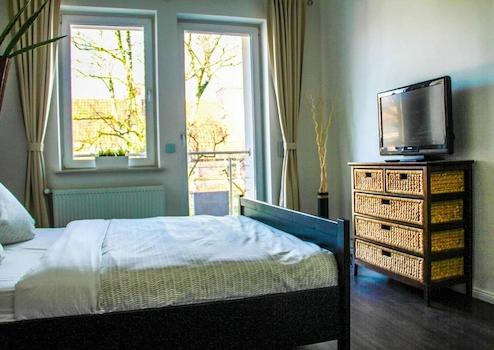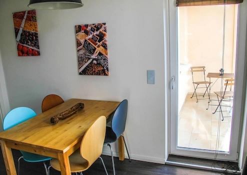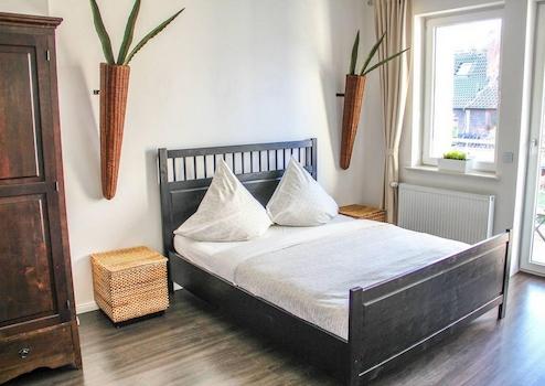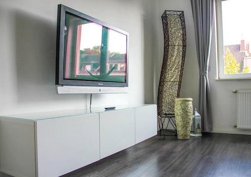 Das Wohnzimmer mit Zugang zum Balkon ist mit einem Sofa, einem Schreibtisch, einer Vitrine, einem Sideboard mit Flat-TV und einem Esstisch mit Platz für vier Personen eingerichtet. Hier befindet sich auch die offene, ...
