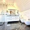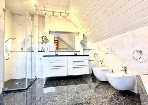 Im OG, das Sie über eine filigrane Treppe mit hochwertigen Kirschbaum-Treppenstufen erreichen, befindet sich ein sehr schönes Studio, ein Zimmer mit privatem Balkon und ein großes Schlafzimmer mit eigenem Tageslichtbad, das keine Wünsche offen läßt. Ausgestattet mit Doppelwaschbecken, Bidet, WC, Badewanne und bodentiefer Dusche. Die Wände sind mit hochwertigen Marmorplatten verkleidet, der Boden und Badewannenverkleidung bestehen aus wunderschönen echtem Pearl Blue Platten. So beginnt Ihr Tag in einer komfortablen, angenehmen Atmosphäre.