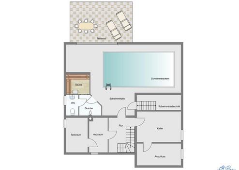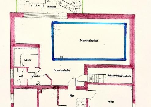 Das innenliegende Schwimmbecken mit Gegenstromanlage und indirekter Beleuchtung bietet Ihnen höchsten Komfort für junge-und jung gebliebene Bewohner und Gäste. Die großzügige, im eleganten Stil eingerichtete Schwimmhalle mit Entspannungsbereich und Blick in den Garten lassen Sie ganzjährig begeistern. Zum Sonnen und Entspannten lädt die große Terrasse ein, die vom Poolbereich über dreifach verglaste, bodentiefe Fensterelemente erreichbar ist. Auf gleicher Ebene befinden sich eine bodentiefe Großraumdusche, WC und eine Sauna sowie Diele, Technikräume und 2 Kellerräume.