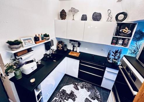 Der offene Wohn- und Essbereich ist mit einer modernen Einbauküche (2020) mit Bosch-Geräten ausgestattet, darunter eine Spülmaschine, eine integrierte Waschmaschine, ein Herd mit Dunstabzug und ein hochwertiger Backofen. Der Wohnbereich öffnet sich zu einem Balkon, der sich perfekt für entspannte Abende mit Blick auf den Sonnenuntergang eignet.