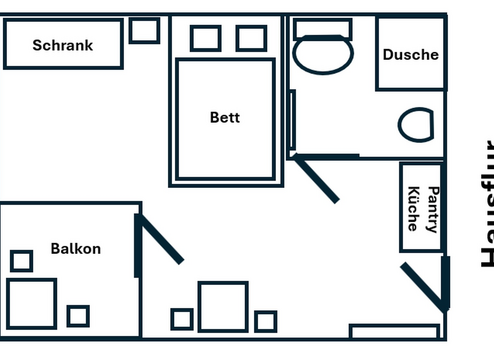 Die voll möblierte 1-Zimmer-Wohnung bietet auf ca. 19 m2 Wohnfläche und zusätzlich ca. 6 m2 Loggia ein durchdachtes Raumkonzept. Zur Ausstattung gehören ein gemütliches Bett (1,40 × 2,00 m), ein 1 m breiter Kleiderschrank, Smart-TV, Hocker, Barhocker sowie ein praktischer Bartisch als Ess- und Arbeitsplatzkombination.