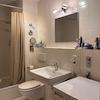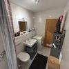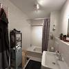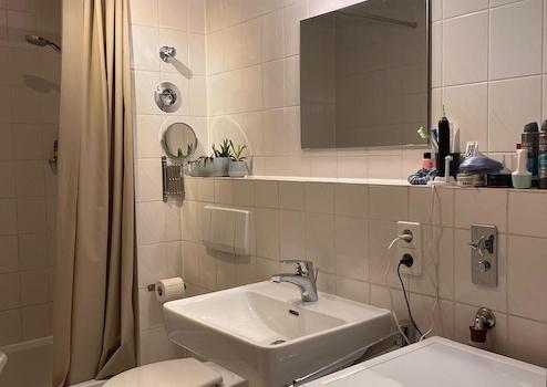 Das Bad ist hell gefliest. Es ist mit einer Dusche und einem Anschluss für die Waschmaschine ausgestattet.