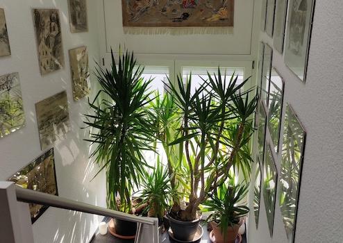 Durch einen schönen Vorgarten, in dem sich ein Fahrradhäuschen befinden, betreten Sie das Haus. Der Eingangsbereich ist durch eine weitere Tür vom Wohnraum abgetrennt. Geradeaus befindet sich das Wohnzimmer mit einer Deckenhöhe vom 3,5 m und anschließend der Wintergarten, der mit zwei großen Schiebetüren über die gesamte Breite von 6,5 Meter ausgestattet ist. Vom Wohnzimmer sehen Sie nach unten in der Kaminraum und nach oben in den offenen Essbereich. Wieder zurück im Treppenhaus gelangt man ein halbes Stockwerk höher auf die schon erwähnte Essempore und gegenüber in die Küche. Weiter geht es in der ersten Stock. Hier befindet sich das neue Bad mit einer ebenerdigen Regendusche, Badewanne, Waschbecken und WC. Das Bad ist mit 60er Fliesen ausgestattet, verfügt über eine Bodenheizung und einen Handtuchheizkörper als Raumteiler zum WC. Der Gang ist mit einem maßgefertigten Einbauschrank mit viel Stauraum ausgestattet. Weiterhin befinden sich in dieser Ebene zwei Zimmer. Von Südzimmer gelangen Sie über eine kleine Treppe auf die erste Dachterrasse. Im zweiten Stock liegen nochmals zwei Zimmer. Im südlichen Zimmer können Sie sich auf der zweiten, überdachten Dachterrasse entspannen, grillen und Ihre Gäste bewirten in der zweiten Küche des Gebäudes, einer Designerküche mit beleuchteter Granitarbeitsplatte, hochwertigen Geräten wie Induktionskochfeld, freischwebender Dunstabzugshaube, Multifunktionsherd (Dampf, Pyrolyse, Grill) und einem begehbaren Vorratsschrank. Der Treppenaufgang verfügt über ein Oberlicht und Fenstertüren. Alle Räume sind mit elektrischen Rollos ausgestattet.