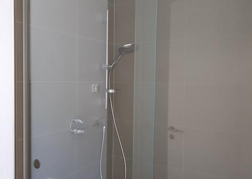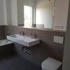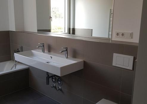 + Badezimmer mit bodentiefer Dusche und Badewanne, zwei Wasserhähnen.