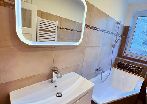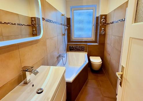 Das neu geflieste Bad mit Fenster verfügt über eine Raumsparwanne, die dem Badezimmer mehr Platz bietet und trotzdem sehr bequem ist, sodass Sie gar nicht merken werden, dass es sich um eine Raumsparwanne handelt.