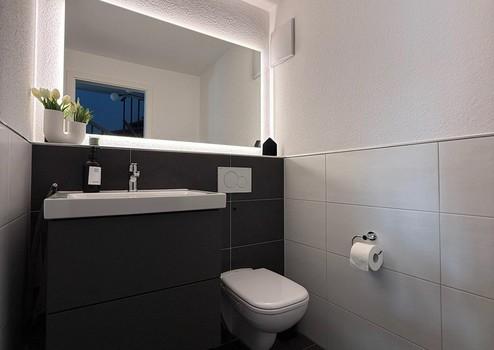 Moderne Design-Einbauküche mit Geräten von Miele, BORA und Bosch, Tageslichtbad mit Doppelwaschbecken und Markenarmaturen sowie ein separates Gäste-WC.