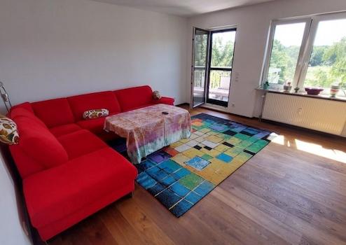 - Einen Balkon, der über Wohnzimmer und Schlafzimmer begehbar ist
