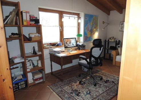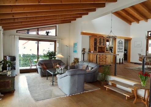 Die obere Etage verfügt über einen lichtdurchfluteten, 60 qm großen offenen Wohn-Essbereich mit schöner, unverbaubarer Aussicht, komplett eingerichtete Küche sowie ein Arbeitszimmer und eine Gästetoilette mit Bidet. Der Lichteinfall von allen vier Seiten sowie von oben erzeugt eine außergewöhnlich schöne Raumatmosphäre.